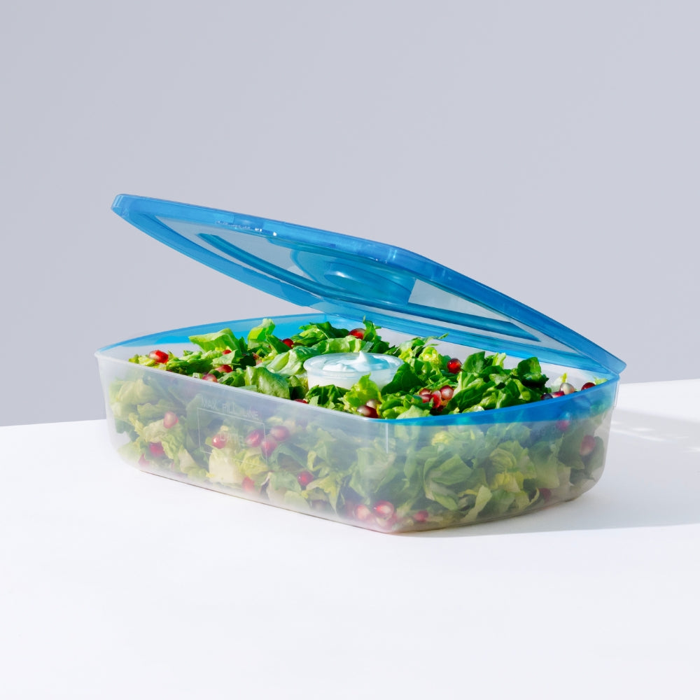 The Mr. Lid Salad Container holds 6 cups (48 oz), making it ideal for full-size salads, grain bowls, or layered lunches. It includes a 4-tablespoon dressing cup that snaps into the base of the container, with a circular fitting on the underside of the lid that seals it in place to stay fresh and prevent spills. Designed for mess-free meals on the go, it keeps your greens crisp and your dressing separate until you're ready to mix.